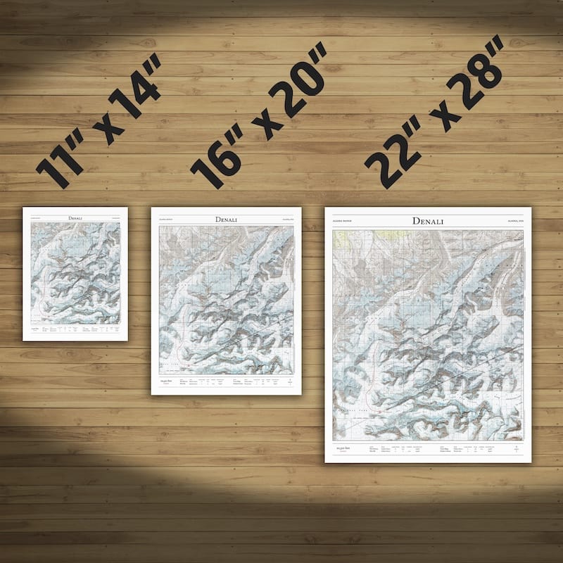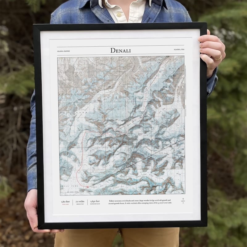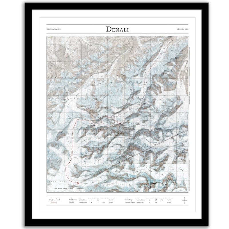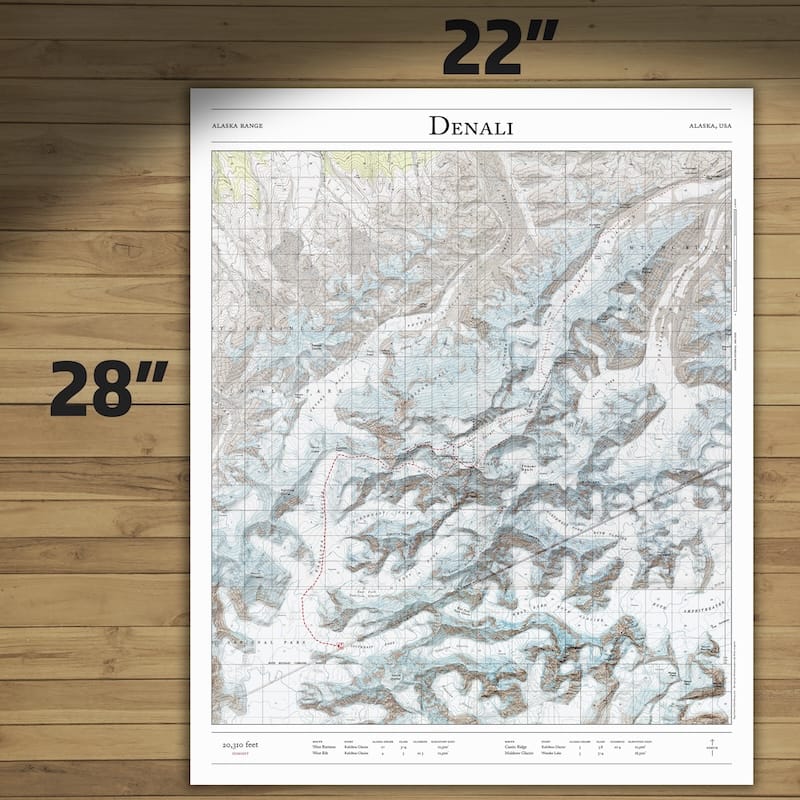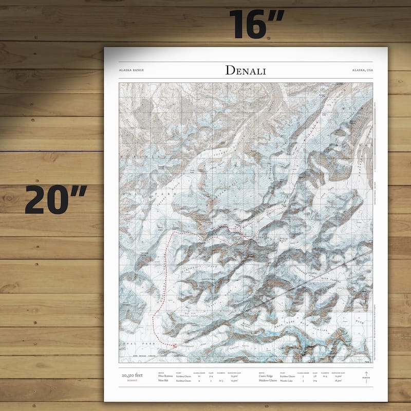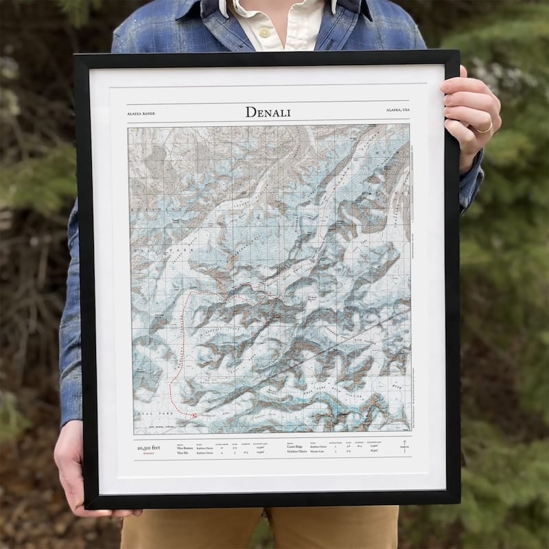 Bring the summit home with this map of the major mountaineering routes to the summit of Denali, the highest mountain in Alaska, the United States, and North America. This 2D print combines hillshading, detailed topography, and trail stats to tell the story of where you’ve been. Made by an independent artist.